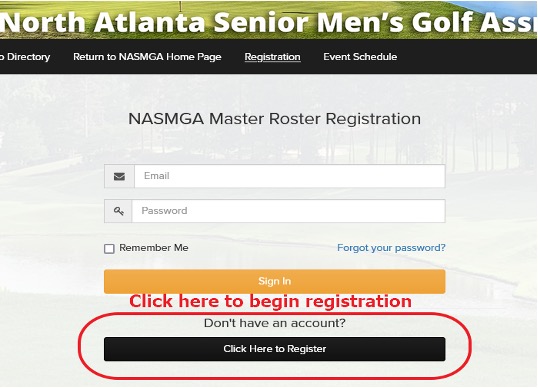 - This link will take you to a page titled “NASMGA Master Roster Registration”. At the bottom of the page, there will be a black button under the heading “Don’t have an account?” See image at right. Click on this black button.